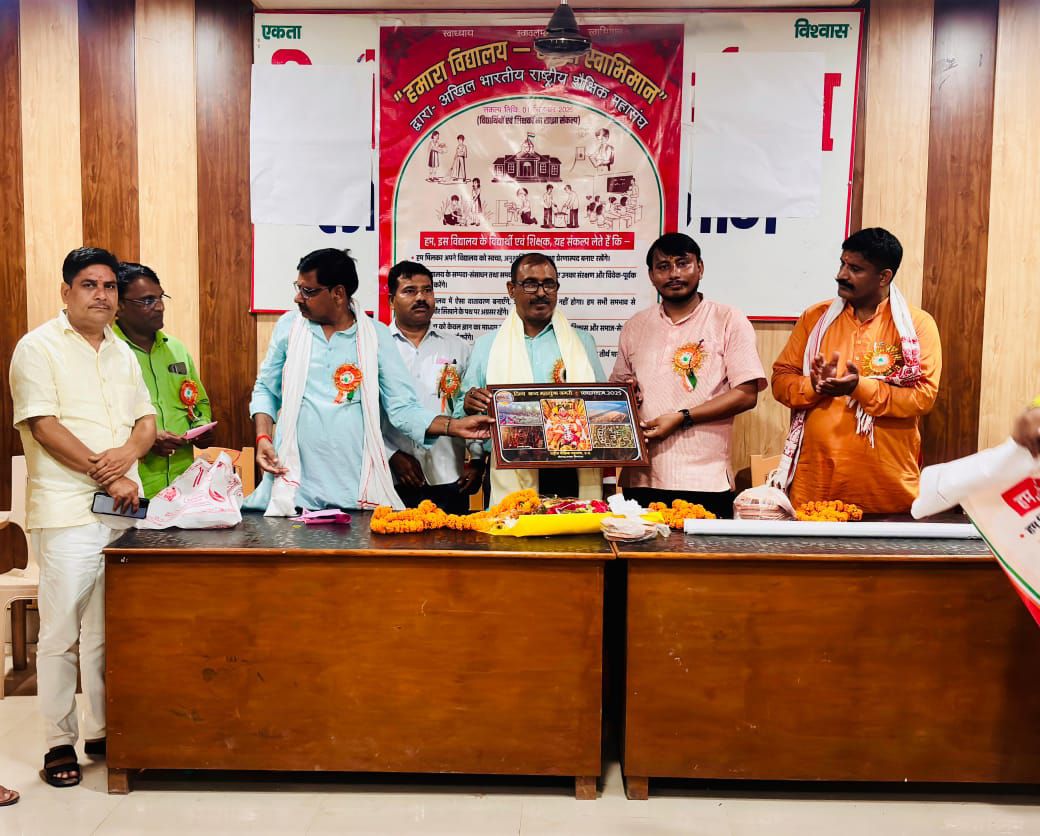 सोनभद्र। अखिल भारतीय राष्ट्रीय शैक्षिक महासंघ के तत्वावधान मे 01 सितंबर 2025 को आयोजित होने वाले “हमारा विद्यालय हमारा स्वाभिमान” कार्यक्रम को सफल बनाने के लिए विन्ध्याचल मण्डल की मण्डलीय समीक्षा बैठक, संघ भवन, सोनभद्र में सम्पन्न हुई। कार्यक्रम में पंच संकल्प पोस्टर,पंफलेट एवं स्टीकर का विमोचन उत्तर प्रदेश के आयाम प्रमुख शशांक कुमार पाण्डेय द्वारा किया गया। आयाम प्रमुख द्वारा बताया गया कि राष्ट्रहित में इस अभियान का उद्देश्य शिक्षा को केवल ज्ञान तक सीमित न रखकर चरित्र निर्माण और समाज सेवा का माध्यम बनाना है। मण्डल के शत् प्रतिशत विद्यालयों पर हमारा विद्यालय – हमारा स्वाभिमान कार्यक्रम मनाने हेतु न्याय पंचायत स्तर पर संयोजक व सहसंयोजक नियुक्त करते हुए सभी विद्यालयों तक महासंघ की पहुंच होनी चाहिए। मण्डल अध्यक्ष विन्ध्याचल मण्डल अखिलेश वत्स जी ने कहा कि केन्द्रीय नेतृत्व के आह्वान पर 1 सितंबर के कार्यक्रम हेतु तीनों जनपदों के लिए विकासखंड स्तर पर संयोजक व सहसंयोजक बना लिए गये हैं जिससे प्रत्येक विद्यालय में वृहद स्तर पर कार्यक्रम मनाया जा सके। इस दिन विद्यार्थी, शिक्षक व अभिभावक पांच संकल्प लेगें। इससे समाज और विद्यालय के मध्य एक मजबूत सम्बन्ध बनेगा। कार्यक्रम संयोजक जिलाध्यक्ष सोनभद्र अशोक कुमार त्रिपाठी ने कार्यक्रम सफल बनाने हेतु जनपद की योजना रचना से अवगत कराते हुए शत प्रतिशत विद्यालय में कार्यक्रम संपन्न कराने की योजना बनाते हुये आये हुए अतिथियों का स्वागत व आभार व्यक्त किया। कार्यक्रम में मीरजापुर जनपद के जिलाध्यक्ष राजनाथ तिवारी व जिलामहामंत्री सत्यव्रत सिंह चंदेल ने संबोधित करते हुए अपने जनपद की कार्ययोजना बताई। आयाम संयोजक सोनभद्र जय प्रकाश विश्वकर्मा द्वारा पांचो संकल्प के विषय में विस्तार से बैठक में बताया व अरूणेश पाण्डेय ने बैठक में कार्यक्रम को सफल बनाने के लिए सुझाव प्रस्तुत किये।