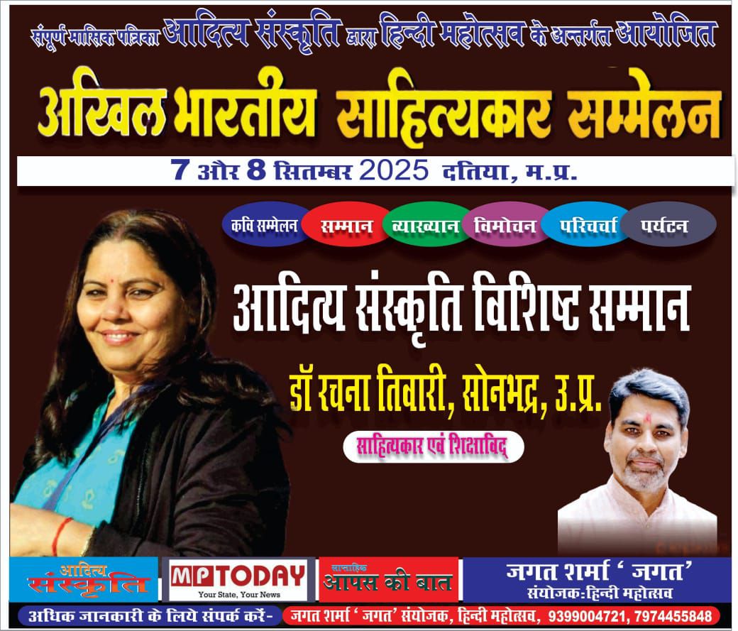 सोनभद्र। सांस्कृतिक मासिक पत्रिका आदित्य संस्कृति द्वारा हिंदी महोत्सव के तहत आयोजित पंचम अखिल भारतीय साहित्यकार सम्मेलन-2025 का आयोजन 7 और 8 सितम्बर को मां पीतांबरा की नगरी दतिया (म.प्र.) में होगा। जिसमें सोनभद्र की कवयित्री डॉक्टर रचना तिवारी को आदित्य संस्कृति विशिष्ट सम्मान से सम्मानित किया जाएगा। यह सम्मेलन होटल ब्लू स्टार, सीतासागर के समीप आयोजित किया जाएगा।