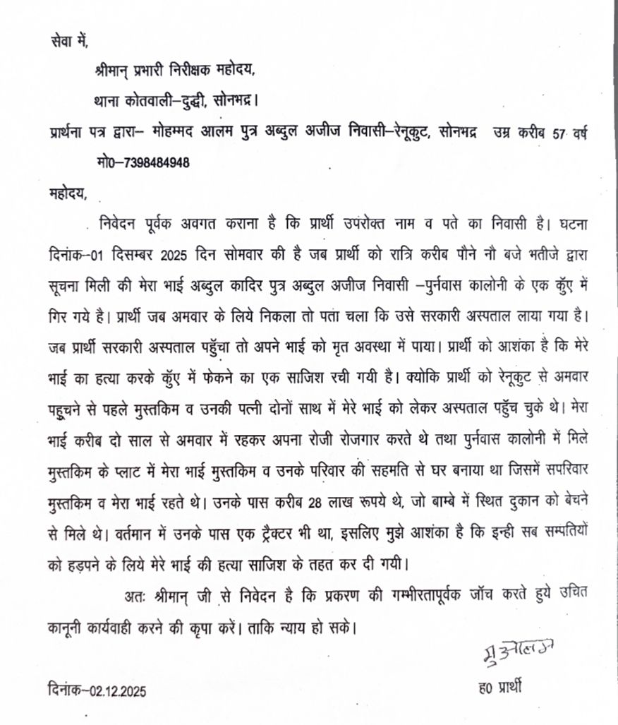 प्रार्थी को आशंका है कि मेरे भाई का हत्या करके कुँए में फेकने का एक साजिश रची गयी है। क्योकि प्रार्थी को रेनूकुट से अमवार पहुंचने से पहले मुस्तकिम व उनकी पत्नी दोनों साथ में मेरे भाई को लेकर अस्पताल पहुँच चुके थे।मेरा भाई करीब दो साल से अमवार में रहकर अपना रोजी रोजगार करते रहते थे।पुनर्वास कालोनी के रहने वाले मुस्तकिम के प्लाट में मेरा भाई परिवार के सर्वसहमति से मकान बनाकर रहते थे।