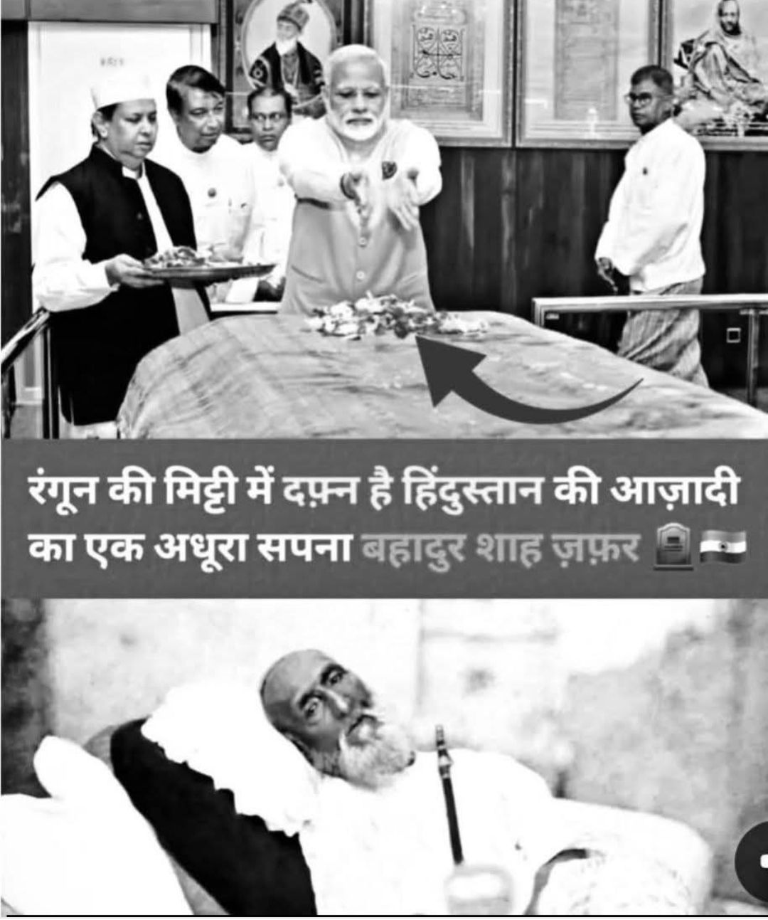 तस्वीर में देश के प्रधानमंत्री नरेंद्र मोदी जी अखंड भारत के उस आखिरी बादशाह की कब्र पर खिराज-ए-अकीदत (श्रद्धांजलि) पेश कर रहे हैं। यह तस्वीर गवाह है कि इतिहास के बलिदानों को कभी मिटाया नहीं जा सकता।