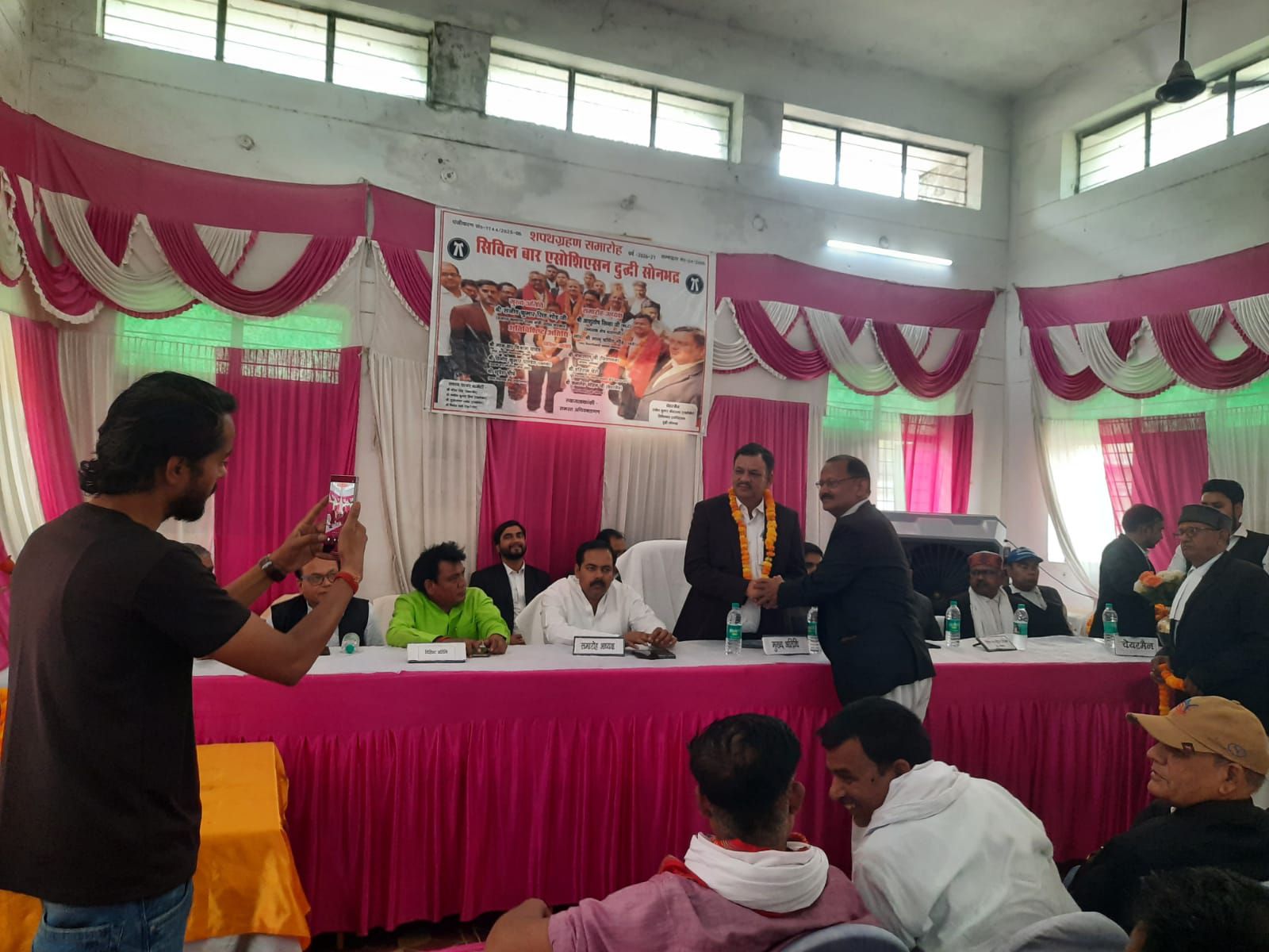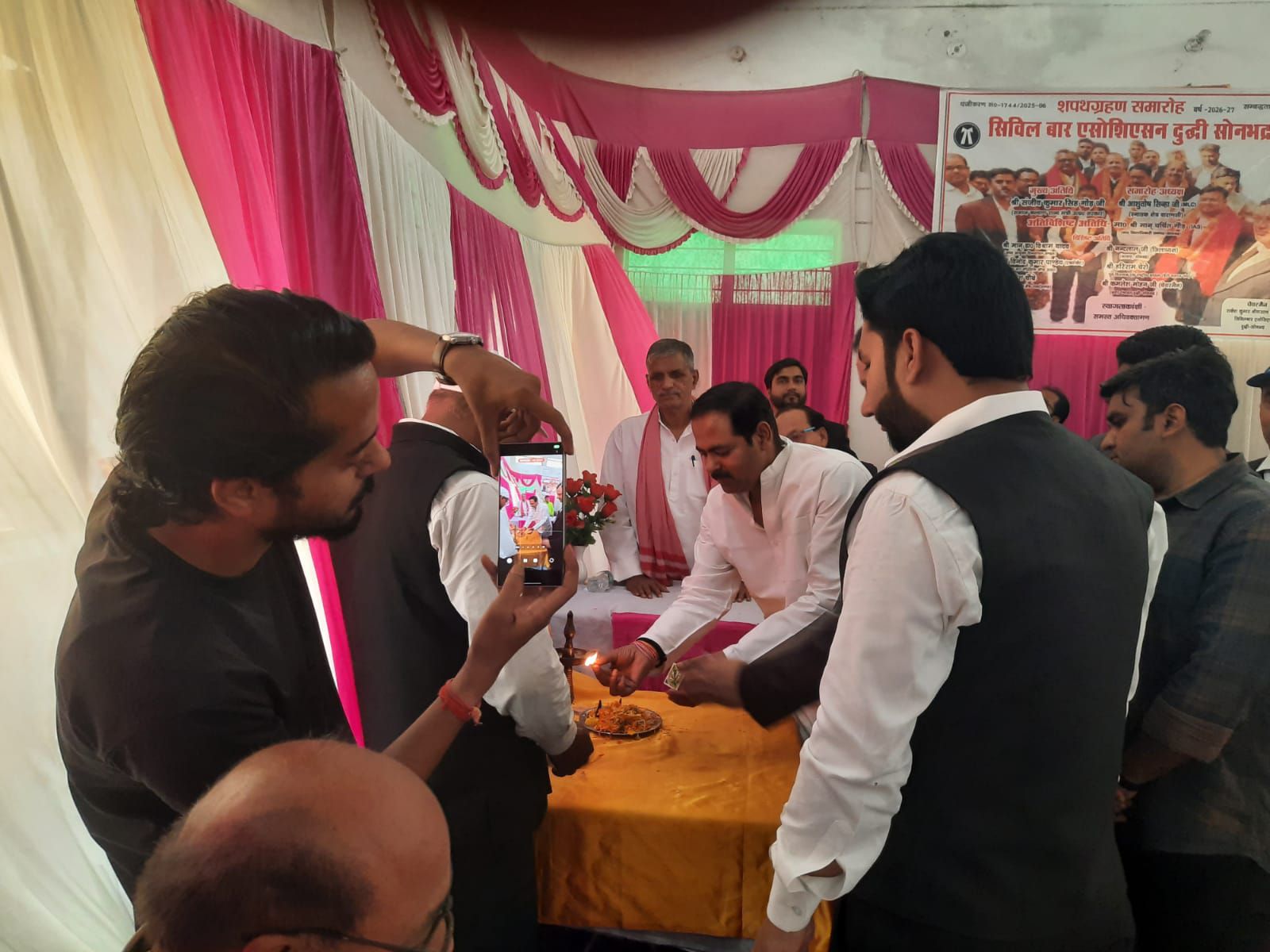 दुद्धी/सोनभद्र।(प्रमोद कुमार)कचहरी परिसर के डॉ. राजेंद्र प्रसाद सभागार में आज सोमवार को सिविल बार एसोसिएशन संघ के नवनिर्वाचित पदाधिकारियों को पद एवं गोपनीयता की शपथ दिलाई गई। रामलोचन तिवारी एडवोकेट को पांचवीं बार अध्यक्ष पद की शपथ दिलाई गई।
